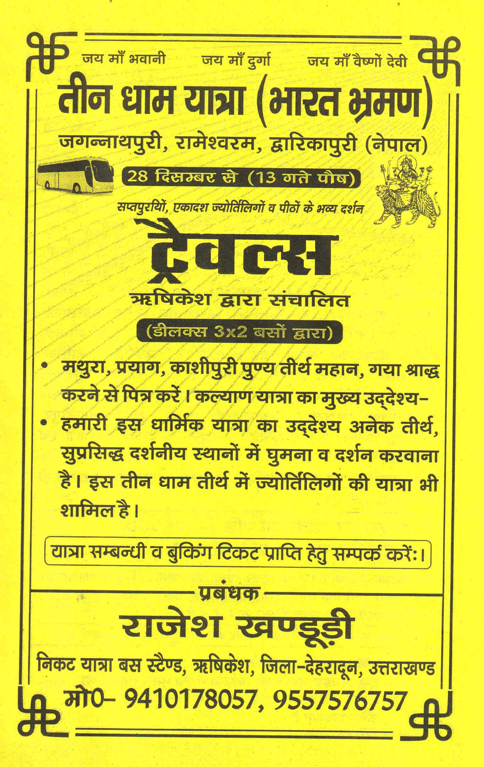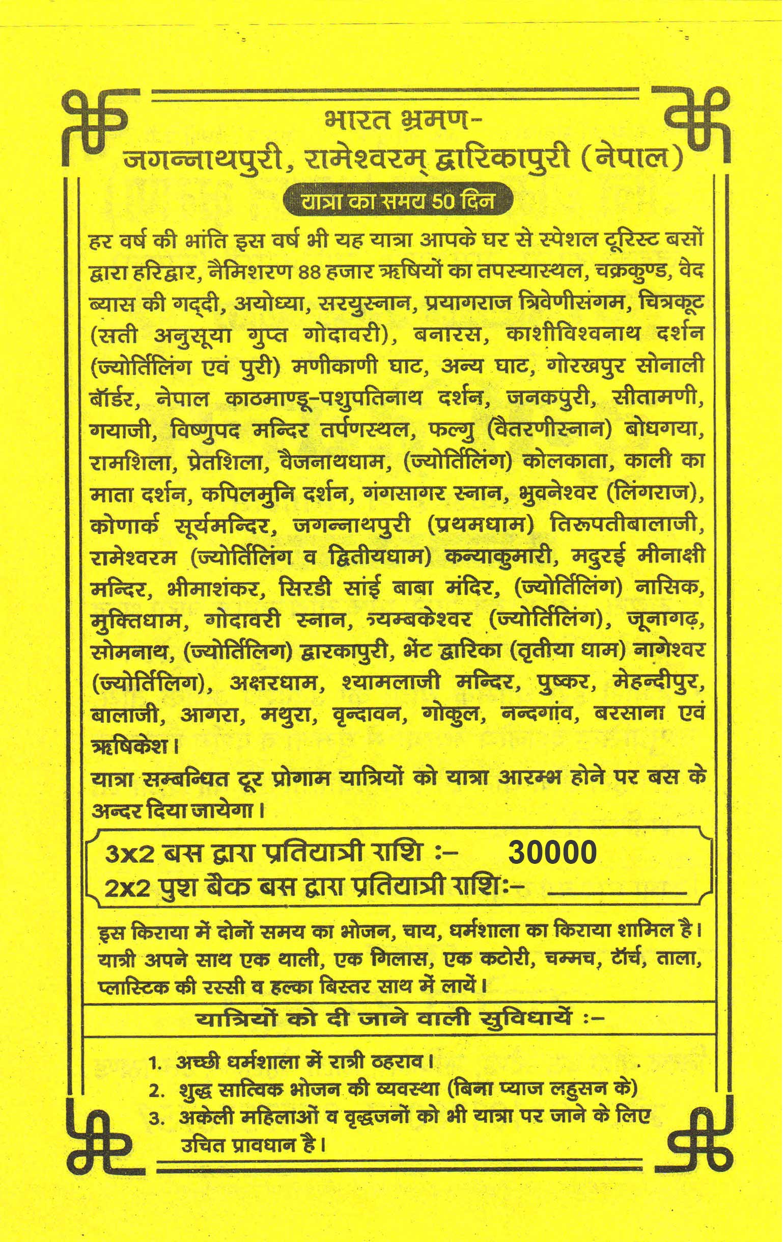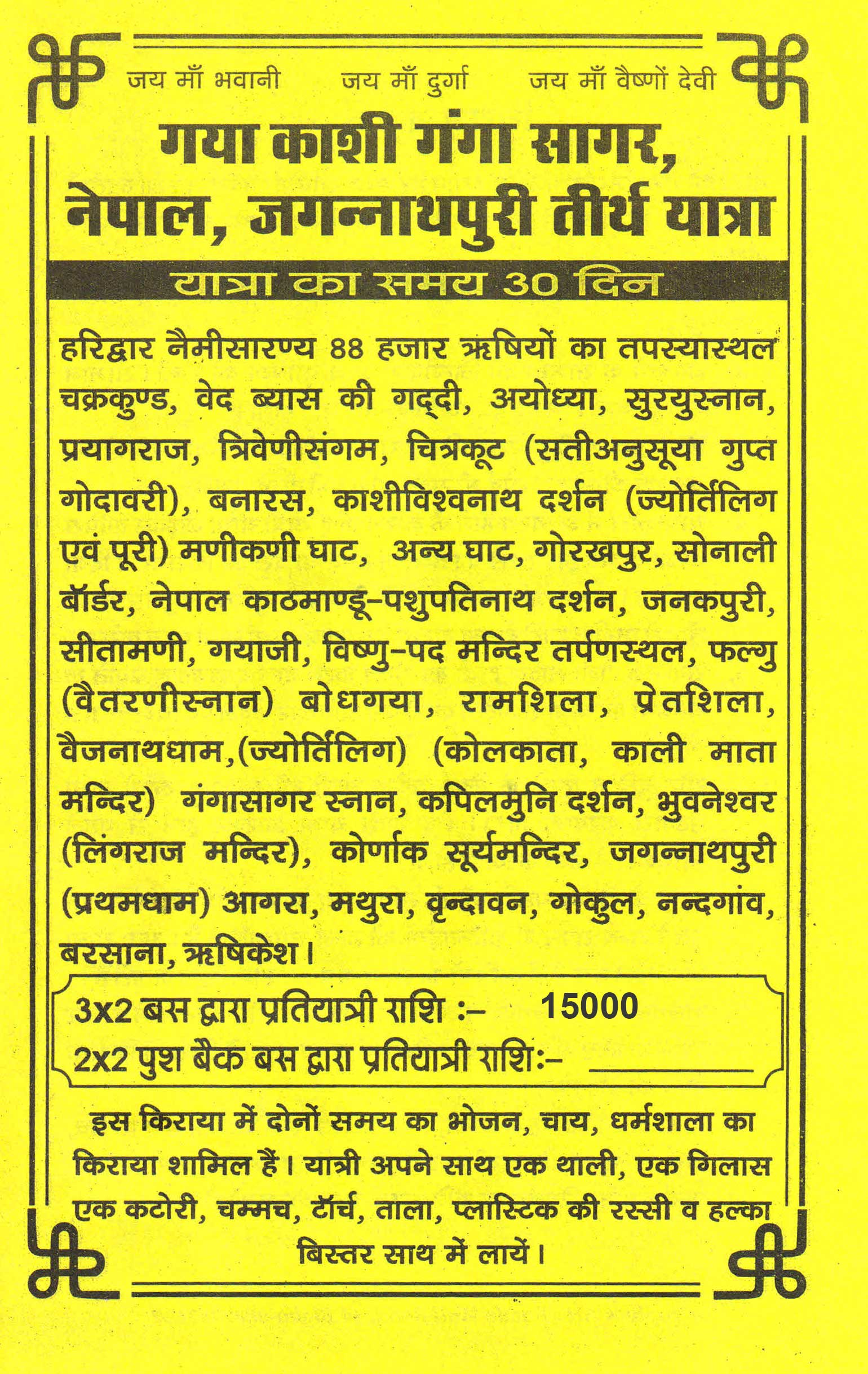 Like every other year, this year also brings you the journey in our special tourist buses right from your home to Haridwar (gateway to god), Nemisharan (austerity place for 88 thousands rishis), Chakrakund also known as Neemsar, Nimsar or Nimkhar temple dedicated to lord Vishnu, Veda Vyas gaddi, Triveni Sangam ( meet of three rivers), Chitrakoot (Sati Anusueya Godawari), Banaras (city of salvation), Kashivishwanath temple visit (Jyotirling and Puri), Manikarnika Ghat (holiest riverfront alongside the river ganga) and some other famous rivers fronts, Gorakhpur (city alongside the Rapti river), Sunauli Border(popular place for overland crossing between the two countries i.e. India and Nepal), Nepal Kathmandu- Pashupatinath temple visit, Janakpuri, Seetamani, Gayaji (which is famous for post death rituals (Pind daan)), Vishnupad temple Darpansthal, Phalgu river (pilgrims first offering must be made for the souls of his ancestors), Bodh Gaya mark its foundation for the attraction of the religious site and place of pilgrimage associated with the Mahabodhi Temple Complex, Ramshila (hill a place famous for the temple of Lord Shiva, Lord Rama, Lord Hanuman and Godess Gauri), Pretshila hill contribution from India in the light of several devotees pay homage/Pinda Daan to their ancestors in order to free their soul, Baba Baidyanath Dham Jyotirlinga, Kolkata Kalimata temple, Gangasagar holy bath, Kapil muni visit, Bhubaneswar lingaraj mandir, Konark Sun Temple, jagannath puri mandir (prime pilgrim), Tirupati balaji, Rameshwaram (Jyotirling), Kanyakumari, Mudharai Meenakshi temple, Bhimashankar, Shirdi Sai baba temple(Jyotirling), Nasik Muktidham, Godawari holy bath, Vyamkeshwar (Jyotirling), Junagadh, Somnath (Jyotirling), Bhent Dwarika, Dwarikapuri, Nageshwar (Jyotirling), Ashardham, Shyamlaji temple, Pushkar temple, Mehndipur balaji temple, Agra, Mathura, Vrindavan, Gokul, Nandgaon, Barsana and Rishikesh (the yoga capital of india).